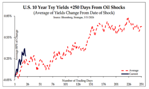 History shows us that following major oil shocks, U.S. 10-year Treasury yields have typically risen by approximately 70 basis points over the subsequent year. We are currently tracking a similar pattern. For you as an investor, this “higher-for-longer” environment creates a more challenging backdrop for stocks.